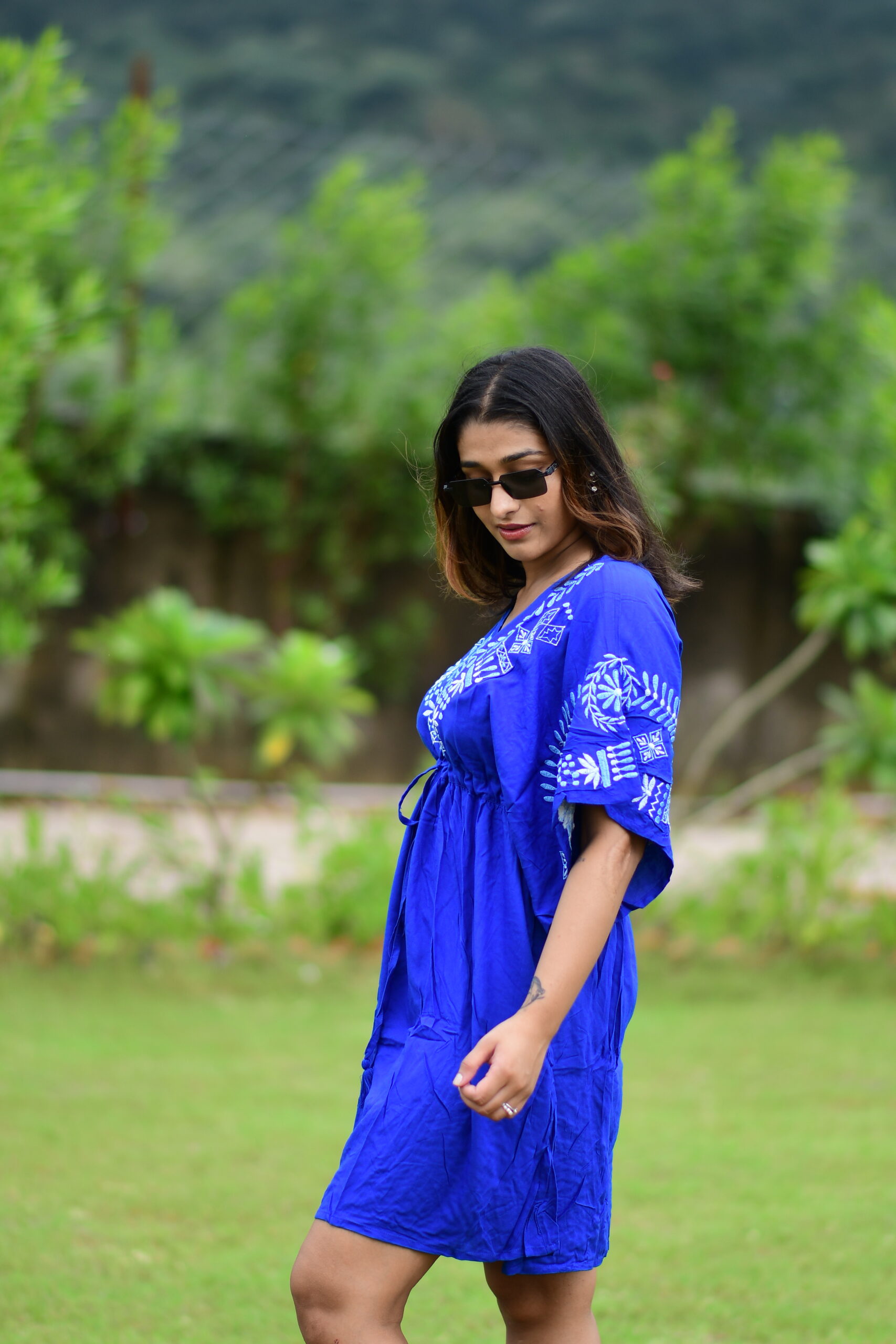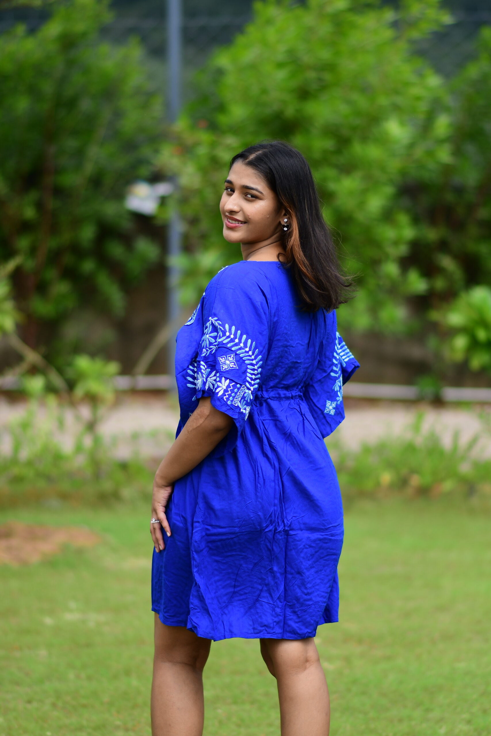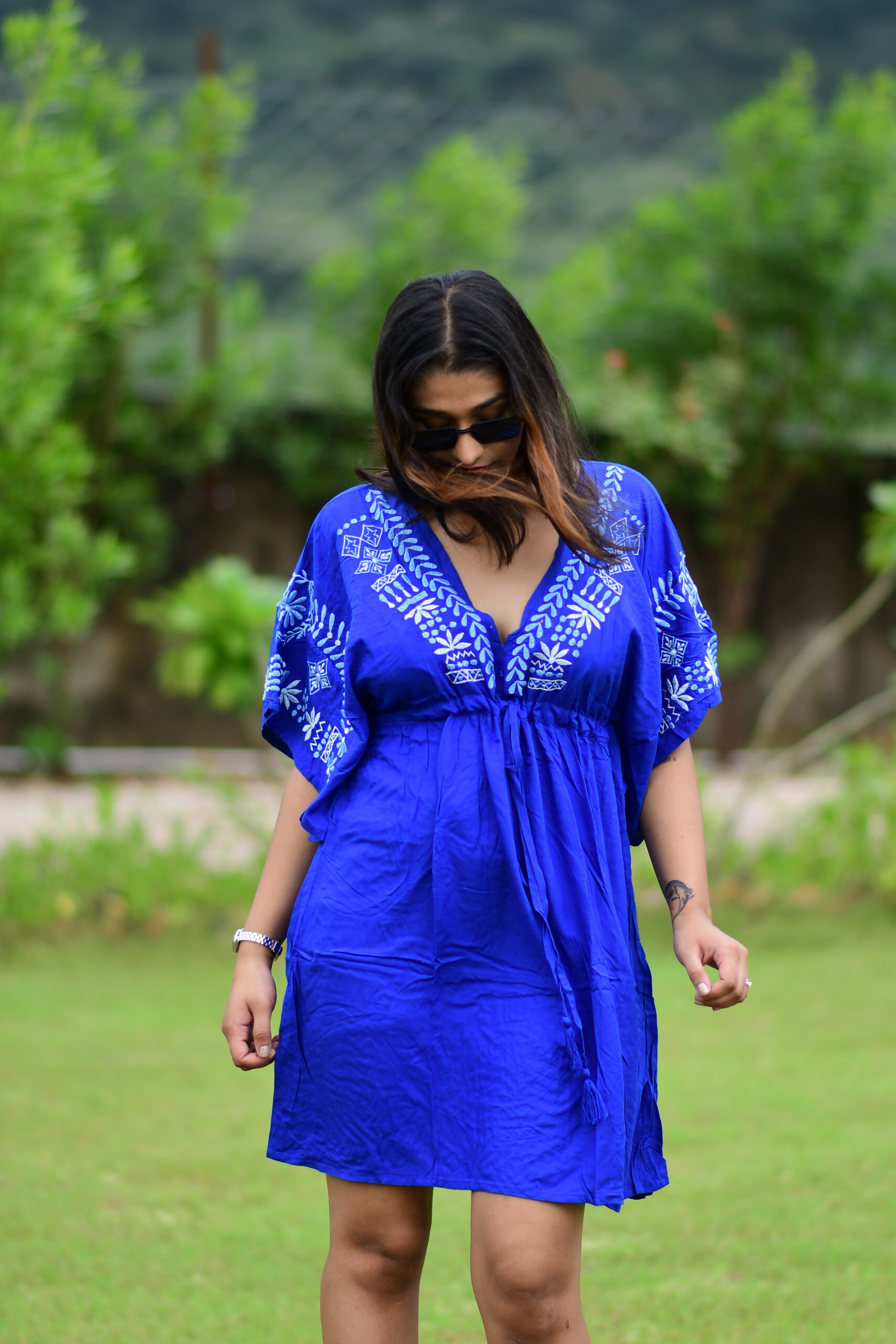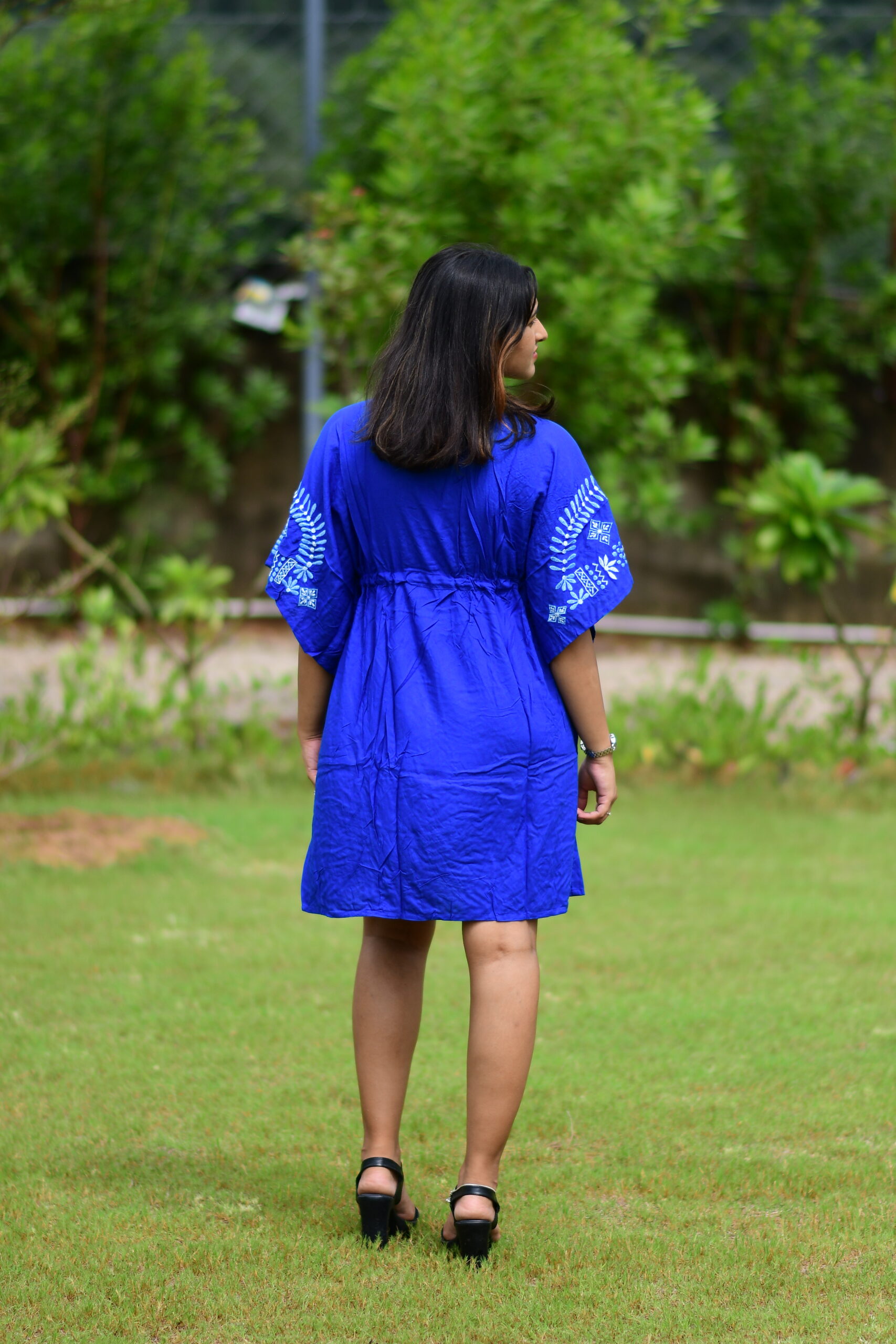 Step into effortless style with this vibrant blue mini dress, designed with chic bohemian flair. Featuring a deep V-neckline, flowy kimono-style sleeves, and delicate white embroidery, this dress adds a playful yet elegant touch to your wardrobe. The adjustable drawstring waist ensures a flattering fit, while the lightweight fabric keeps you cool and comfortable all day long. Perfect for casual outings, beach vacations, or festive get-togethers, this dress is a versatile must-have.