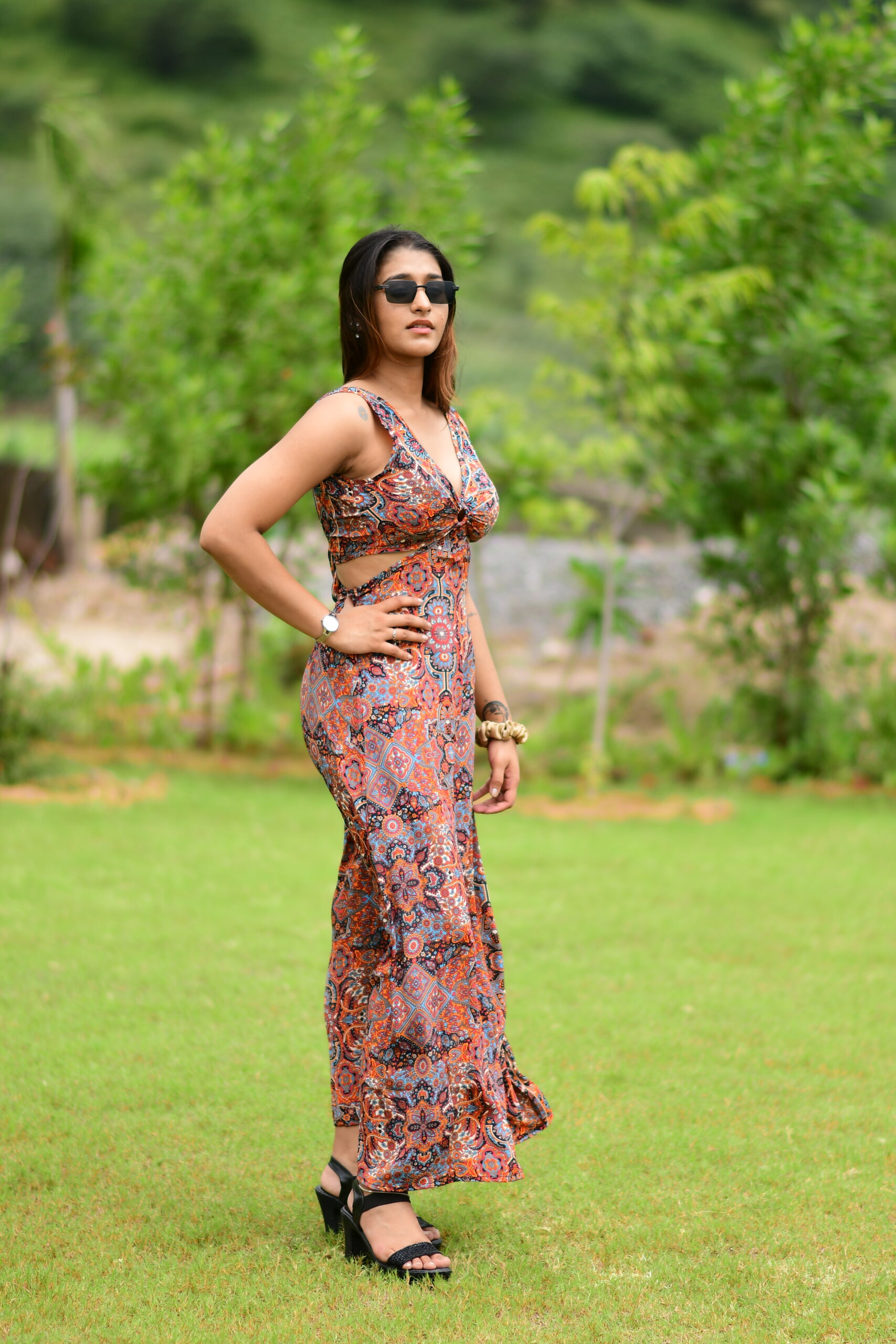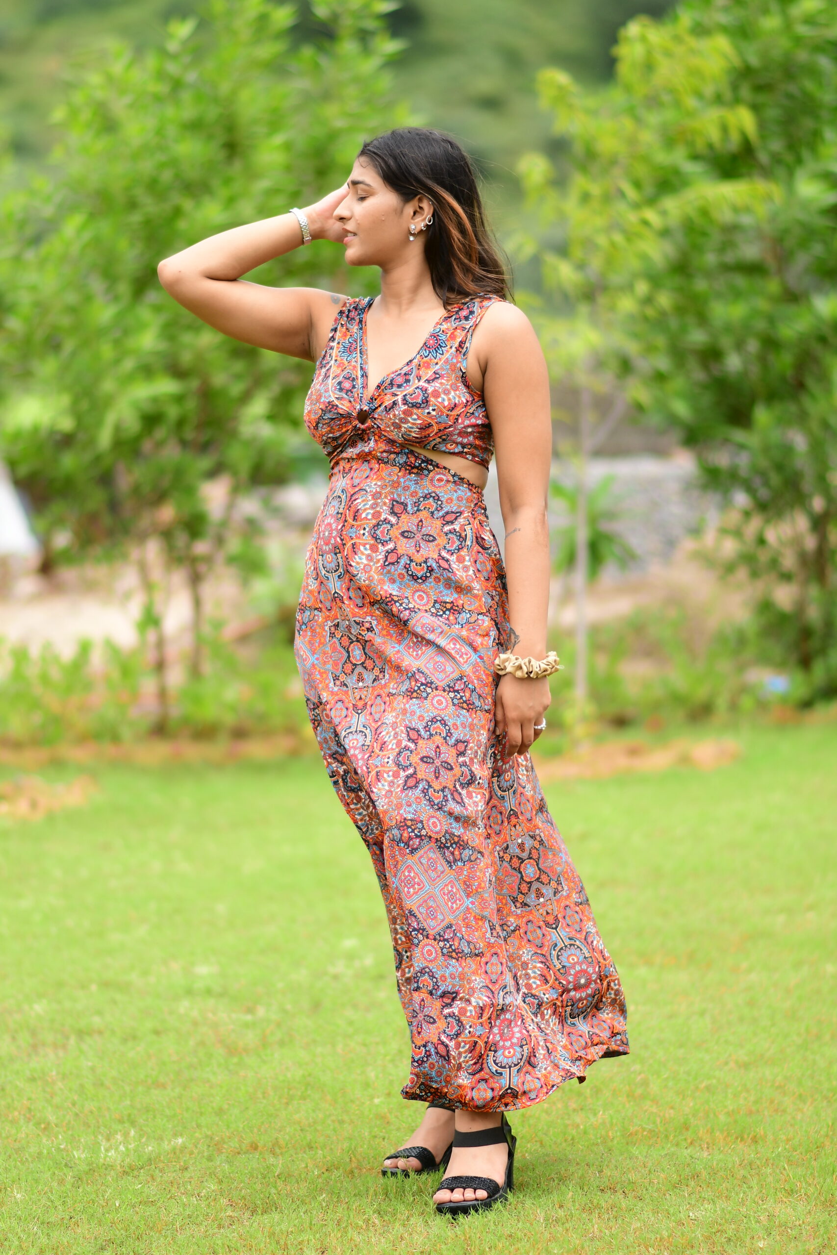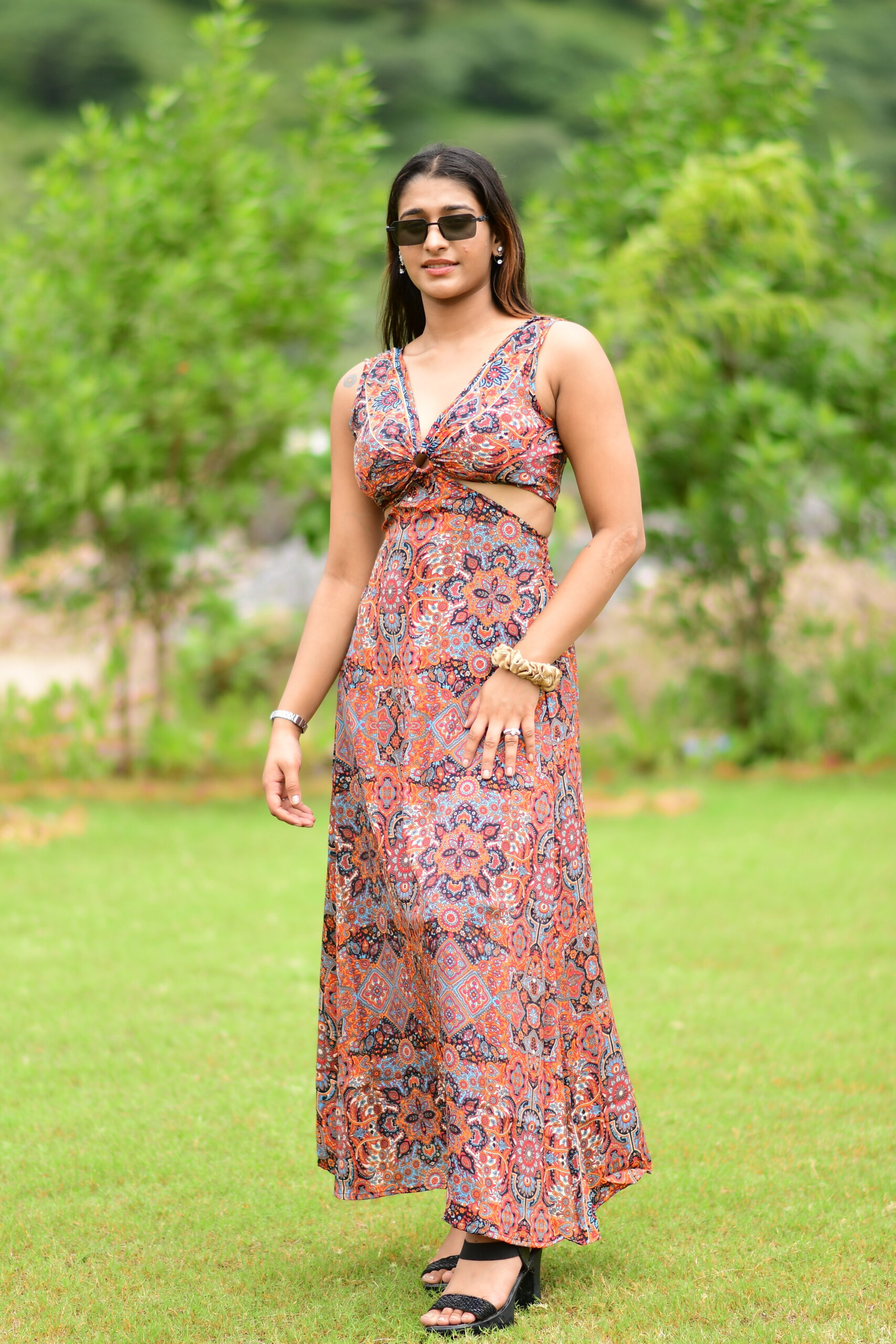 Make a bold yet elegant statement with this Casturi silk long ring dress. Featuring a stylish ring detail at the bust with cut-out accents, this dress offers a chic contemporary look. The flowing ankle-length silhouette combined with vibrant printed patterns makes it perfect for summer outings, beach vacations, brunches, or evening get-togethers.