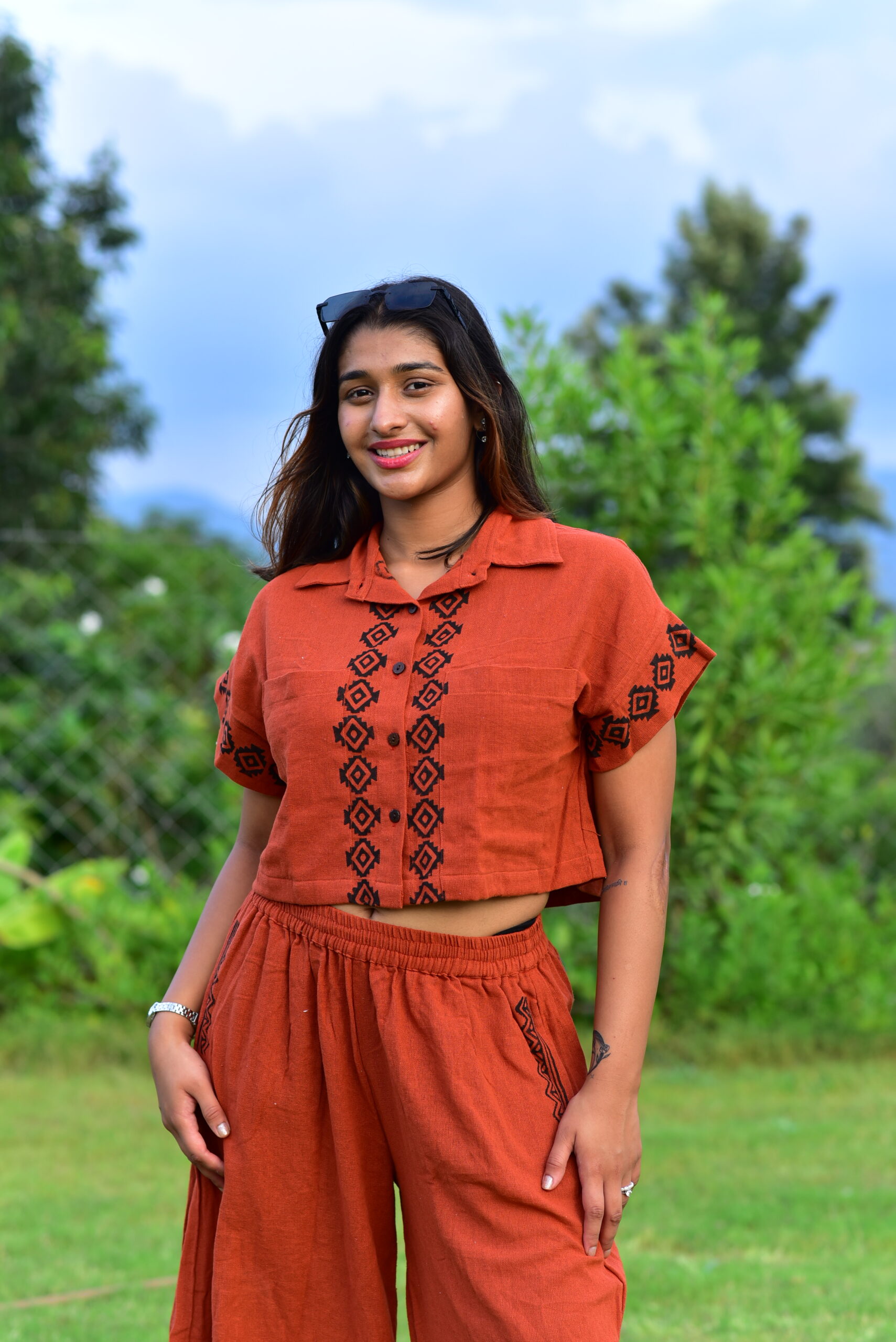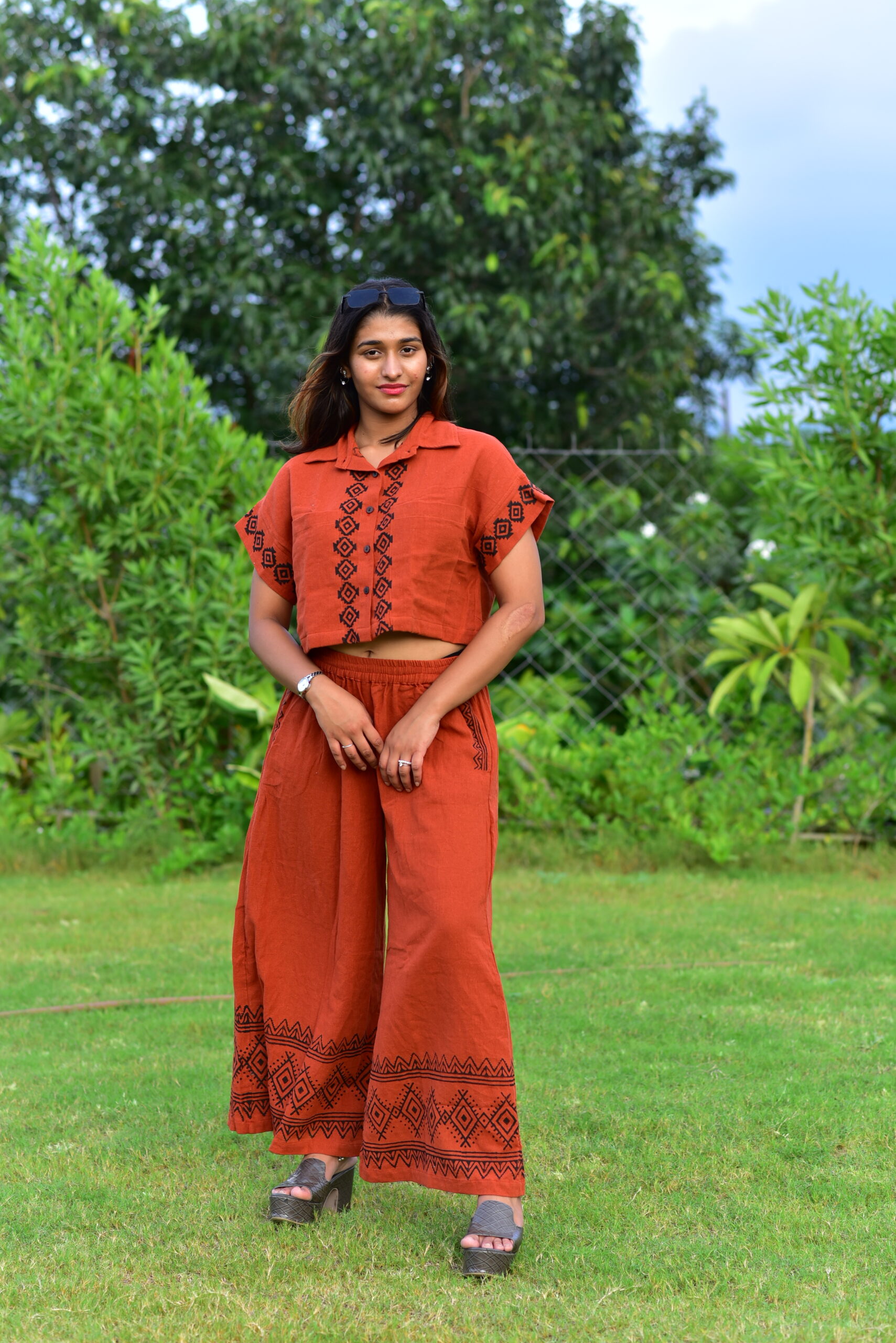 Inject vibrant style into your wardrobe with this striking Cotton Hemp Cord Set. This two-piece ensemble features a chic collar crop top and flowing plazo pajama trousers, both enriched with bold block print detailing. Crafted from a comfortable Cotton Hemp blend, this set in a beautiful rust/terracotta hue offers a unique texture and a sophisticated, artistic look perfect for making a statement.