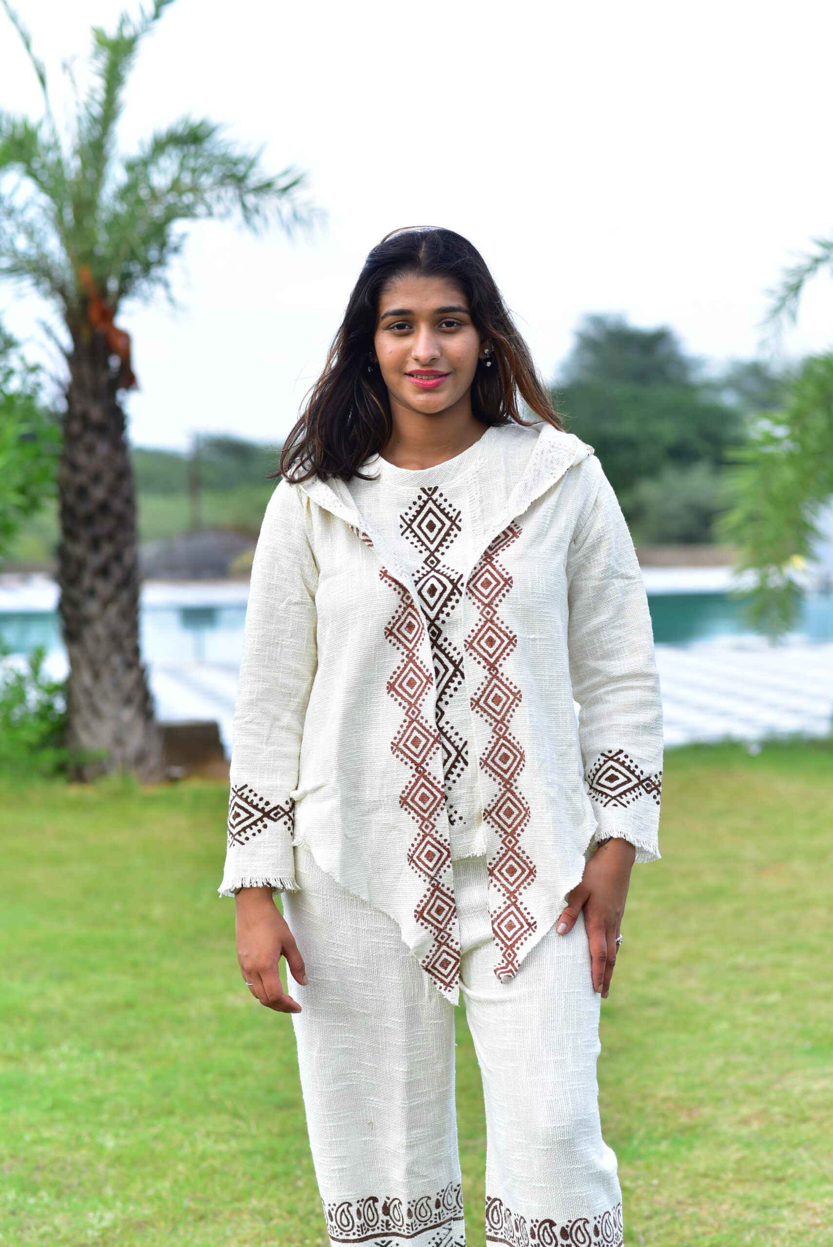 Design: Hooded Long Sleeve Top and Two-Pocket Pajama Cord Set – A coordinated ensemble featuring unique block print detailing.