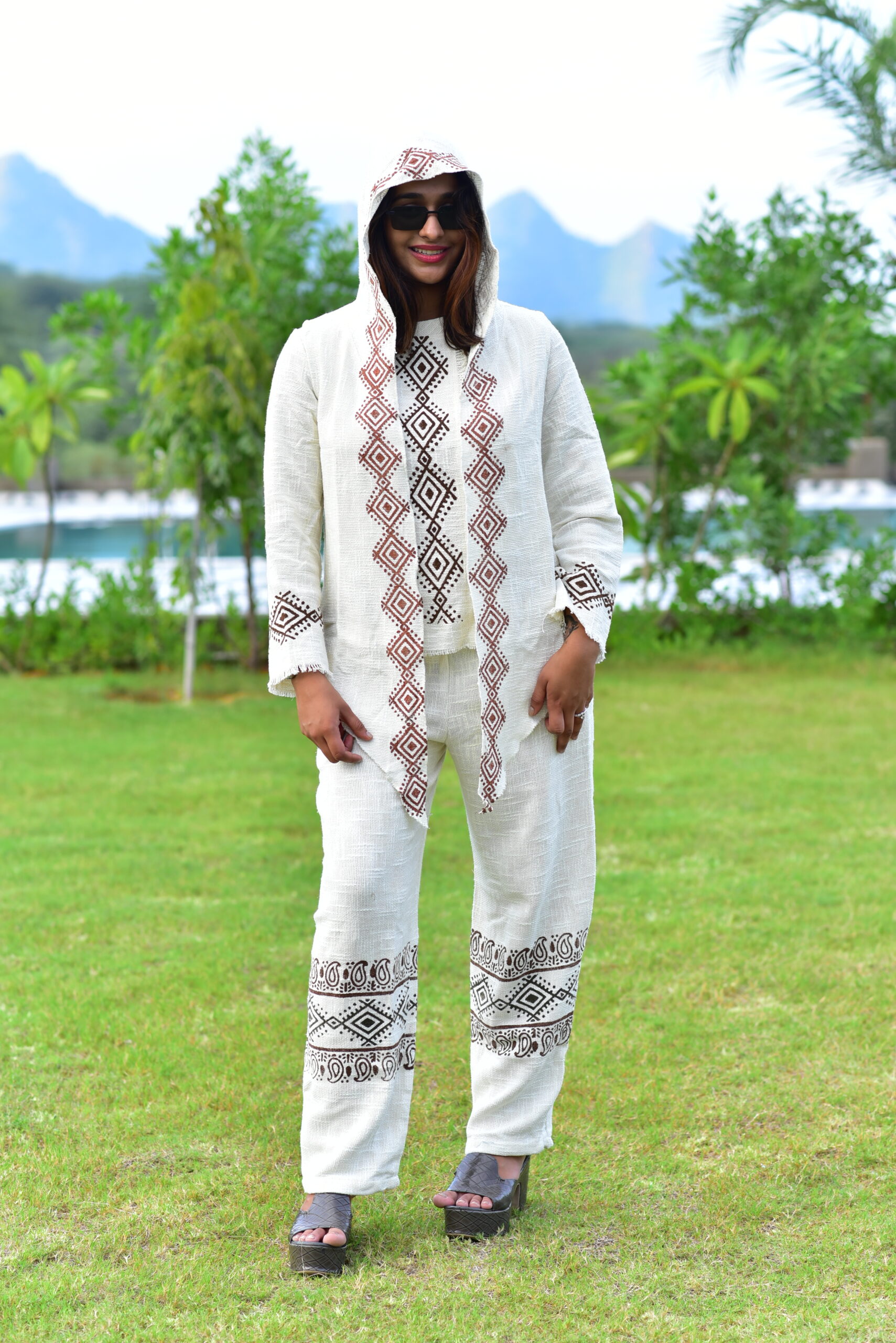 Women’s Hemp Cotton Block Print Cord Set – Hooded Long Sleeve Top & Two-Pocket Pajama
