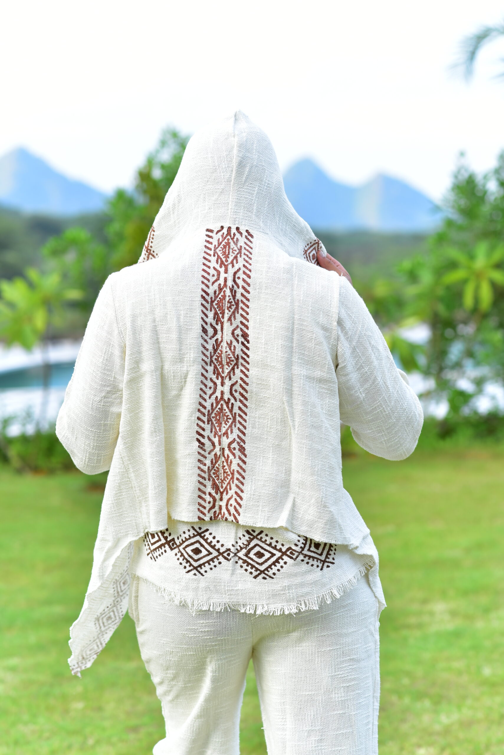 Embrace artisanal comfort with this distinctive Hemp Cotton Cord Set. This two-piece ensemble features a unique hooded long sleeve top and matching two-pocket pajama trousers, both adorned with intricate geometric block print patterns. Crafted from a sustainable Hemp Cotton blend, this set offers a wonderfully soft texture and an artistic touch, perfect for relaxed yet refined living.