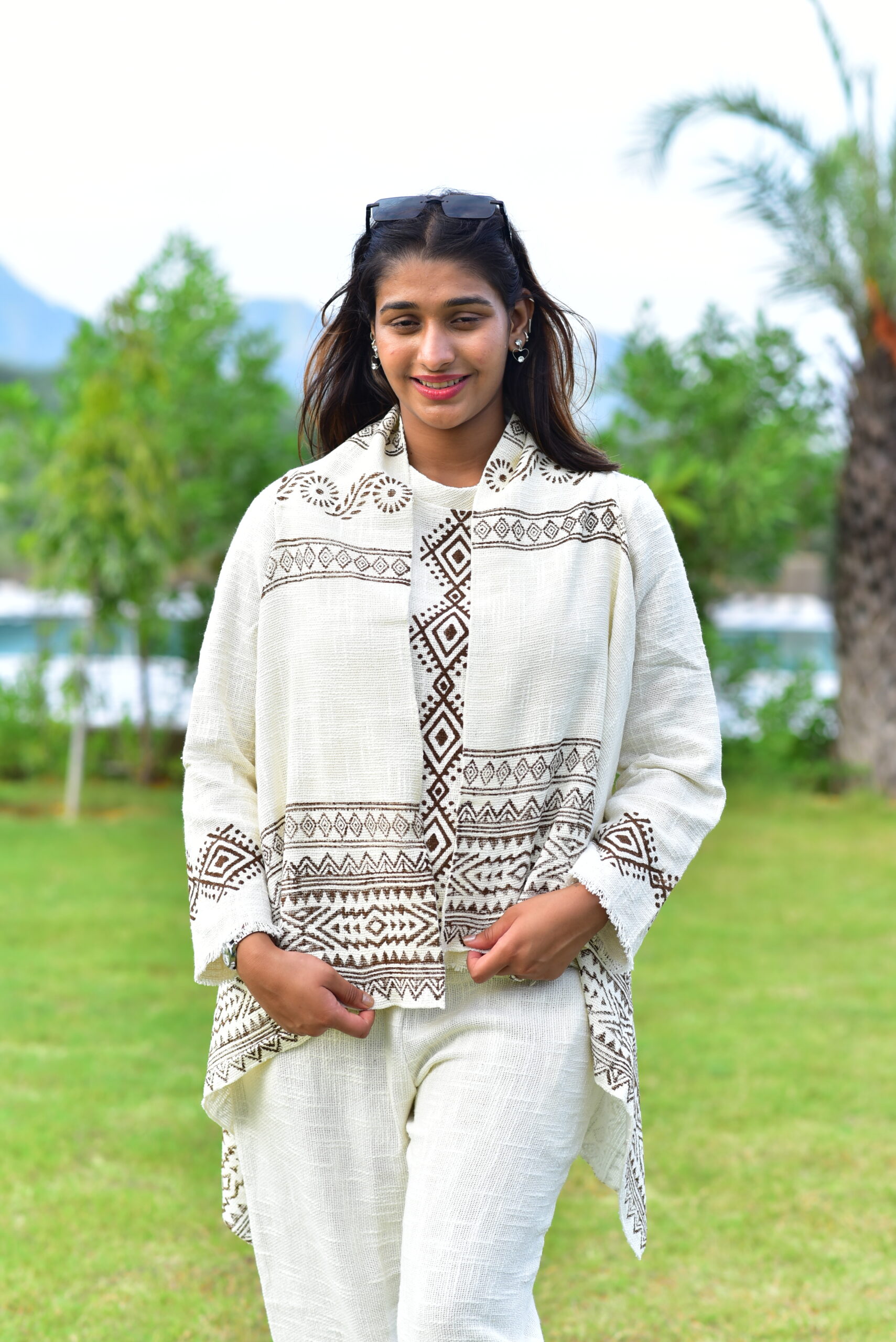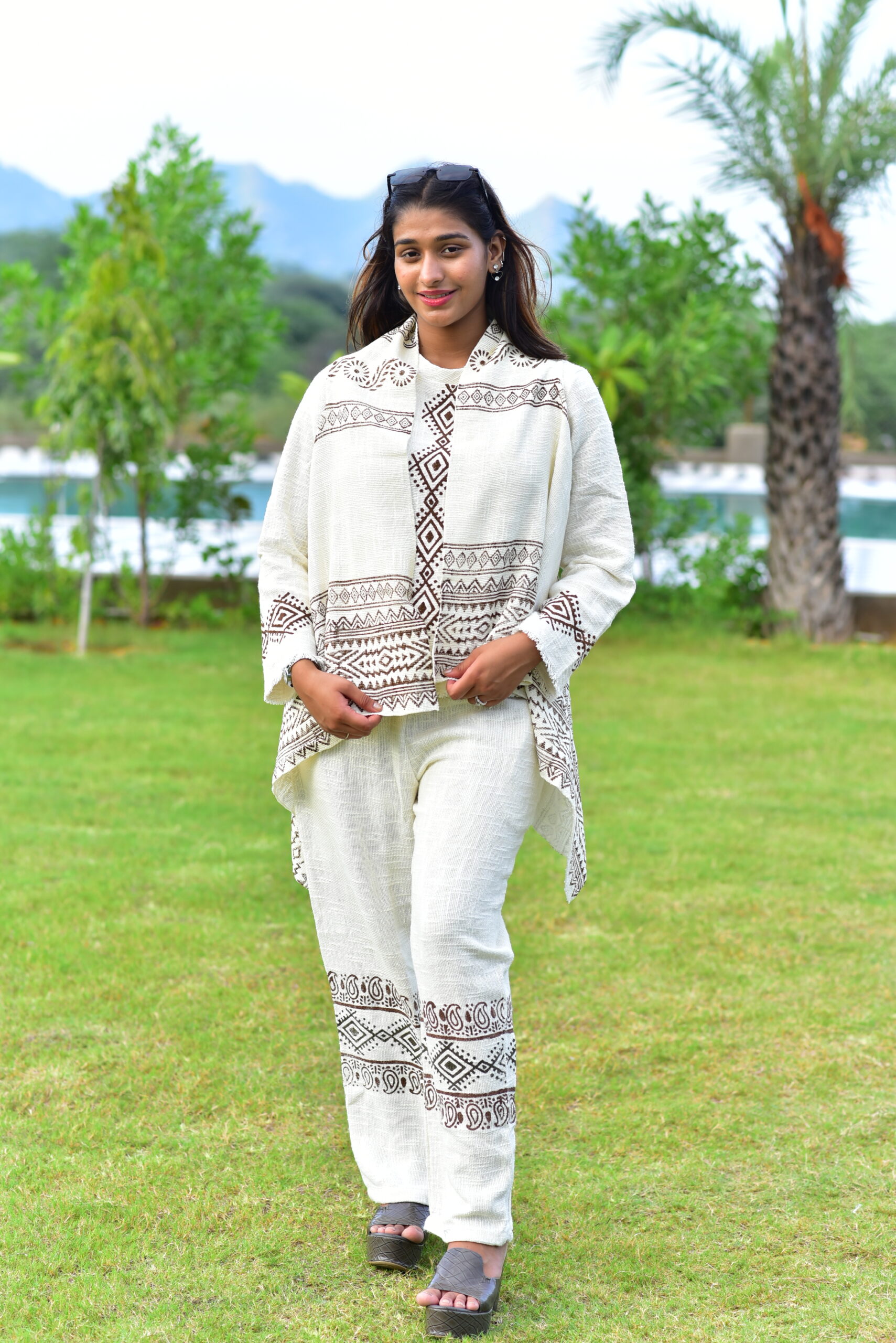 Women’s Hemp Cotton Block Print Cord Set – Layered Top, Poncho & Two-Pocket Trouser (3-Piece)
